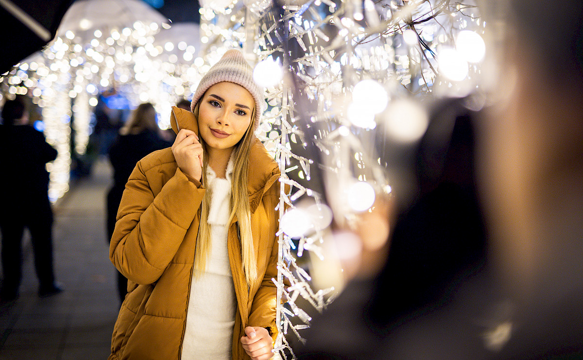 Fotografický workshop s modelkou ve večerních ulicích Prahy s vánoční atmosférou.